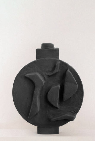 Dos Caras is a sculptural piece that honors Curiel’s Mexican heritage. It features accents inspired by billowing forms and rocks, drawing from Curiel’s childhood memories of bathing in the river at her grandmother’s house in Mexico. The name, Spanish for “two faces,” reflects the work’s dual-sided base, each side presenting a distinct arrangement of forms. Designed as both an art object and a functional vessel, it can hold a candle or a single flower stem, or stand on its own as a contemplative form.